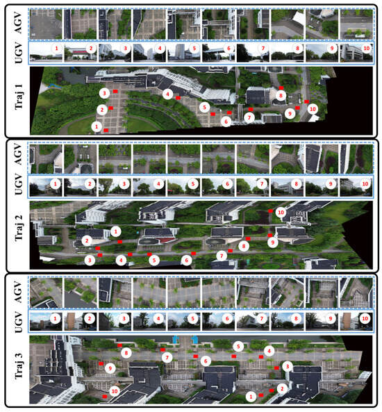 Illustration of representative landmark positions with distinct scene characteristics (e.g., intersections and turning points) for each trajectory. The corresponding UGV and UAV image pairs are shown to demonstrate cross-view visual differences.