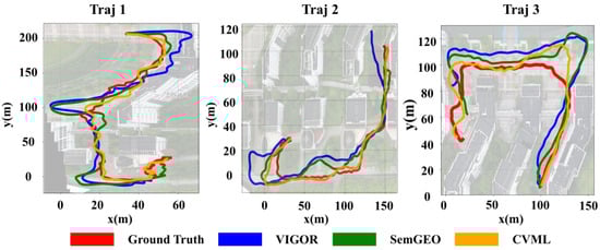 Figure 9 illustrates the comparison between the ground truth and the trajectories generated by VIGOR, SemGEO, and the proposed CVML, separately. The associated error distribution relative to the ground truth of each algorithm is shown in Figure 10. Overall, the trajectories generated by the proposed CVML align most closely with the ground truth, followed by SemGEO, while VIGOR exhibits the largest deviations. The most significant discrepancies are usually observed at turning regions, as shown in Traj 1 and Traj 3. The turning regions typically correspond to complex environments containing buildings, roads, trees, and other structures. Moreover, the UGV’s limited field of view may result in incomplete visual information, which degrades the matching performance of compared algorithms. This limitation is particularly detrimental to VIGOR, as its framework relies heavily on panoramic street-view imagery for accurate matching. Table 12 summarizes the trajectory localization errors of the three methods, and the proposed CVML consistently achieves the lowest average localization error across all trajectories, reducing the error by up to compared with VIGOR and by more than compared with SemGEO. Additionally, the proposed CVML exhibits the smallest standard deviation in all trajectories as well, indicating superior robustness and stability.