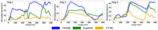 It can be observed that CVML consistently achieves the lowest localization error across all landmark points of the evaluated trajectories, with average errors of 4.8 m, 8.6 m, and 12.4 m in the three scenarios, respectively. In contrast, VIGOR reports errors of 28.4 m, 25.9 m, and 29.3 m, indicating that CVML improves localization accuracy by , , and , respectively.
