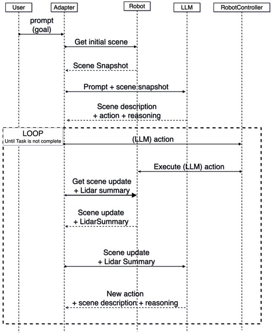 After each executed action, the Adapter assesses task completion by acquiring updated observations. It captures a new scene snapshot and retrieves a summary of range data from the onboard 2D LiDAR sensor. This refreshed multimodal context is provided back to the LLM for the next reasoning step. Crucially, the Adapter maintains a running history of all previous prompts and corresponding image observations within the current task. The new multimodal data (current image and text summary) are appended to this history, and the complete conversational history is sent to the LLM to provide the necessary memory for long-term planning and coherence. This closed-loop continues until the LLM determines that the specified goal has been achieved. At that point, the system resets and awaits the next user instruction.