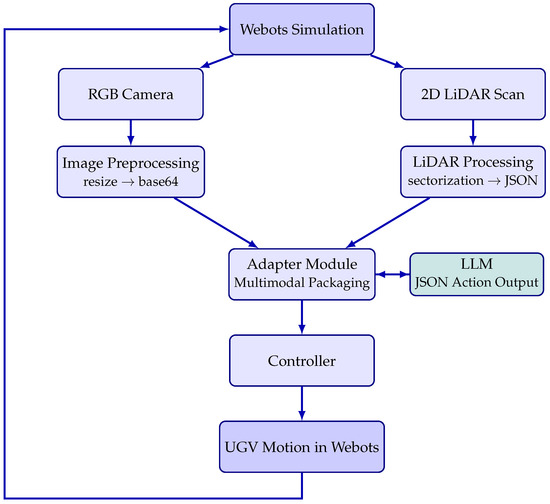 Figure 3 illustrates the end-to-end flow of data from the Webots simulation to the LLM and back to the UGV controller. The pipeline comprises four major stages: image preprocessing, LiDAR summarization, multimodal packaging, and LLM interaction.