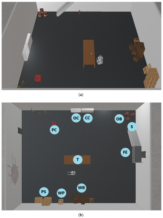 All experiments were carried out within the Webots [45], that is a professional mobile robot simulation software that provides a rapid prototyping environment. We employed the version R2025a, that run on a MacBook Pro M4 with 16GB RAM. In particular, we used the factory world file available in Webots [46], depicted in Figure 4, where we added a fire extinguisher, and a red plastic basket. Figure 4b provide a top view of the simulation environment where each object has been labeled in the following way: Open cabinet (OC), Closed cabinet (CC), Plastic crate (PC), Table (T), Wooden Pallet (WP), Pallet Stack (PS), Wooden Box (WB), Stairs (S), Oil barrels (OB), and Fire extinguisher (FE). Within this environment, a Clearpath PR2 robot [47] was used as a representative UGV platform. While PR2 is primarily a research-oriented mobile manipulator, its wheeled base, vision sensors, and onboard LiDAR make it an effective proxy for UGVs in simulation-based evaluations of autonomous navigation and perception. Both Gemini 2.0 Flash and Gemini 2.0 Flash-Lite were used thorugh their APIs. The code is available in the following GitHub repository (https://github.com/kelvindev15/webots-llm-robotcontroller, accessed on 26 November 2025).