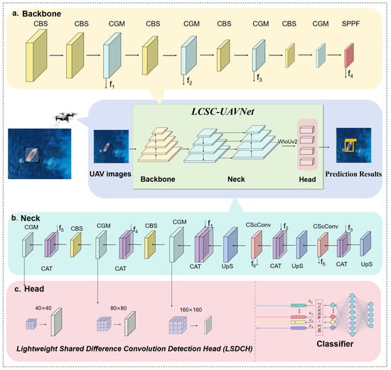 Overall network architecture of the LCSC-UAVNet model. (a) Backbone; (b) Neck; (c) Head.