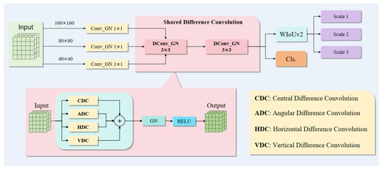 In traditional detection head designs, independent detection heads are typically employed at different feature levels, resulting in low parameter utilization efficiency. To address this issue and enhance the model’s performance in handling complex maritime environments and multi-scale objects, we developed a new detection head called the Lightweight Shared Difference Convolution Detection Head (LSDCH). The structure is illustrated in Figure 2 below. This detection head improves parameter utilization by sharing convolutional layers while incorporating various differential convolution techniques to enhance the capture of object details.