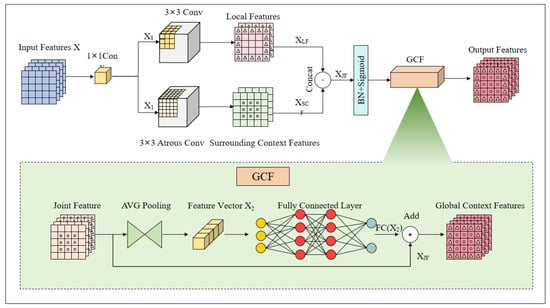 is subsequently fed into the Global Context Feature layer to generate Global Context Features (). is compressed into a feature vector through an average pooling operation, followed by a fully connected layer that assigns weights to different channels, enhancing key features while suppressing irrelevant ones. The final output, denoted as (), is then added to , resulting in , expressed as follows:
