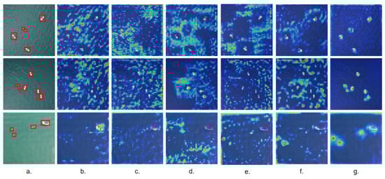 In the ablation experiments, feature analysis of the SeaDroneSee dataset’s test set was conducted using heatmaps. Figure 5 illustrates the attention analysis results of the LCSC-UAVNet model, arranged from left to right as follows: (a) groud truth, (b) Ablation 1 heatmap, (c) Ablation 2 heatmap, (d) Ablation 3 heatmap, (e) Ablation 4 heatmap, (f) Ablation 5 heatmap, and (g) LCSC-UAVNet algorithm heatmap. The intensity of colors in the heatmaps indicates the model’s focus on image regions during object detection predictions. Through comparison, it is evident that the LCSC-UAVNet model shows deeper colors in the heatmap where small objects are located, highlighting its ability to focus on small objects compared to the ablation algorithms. This visual analysis demonstrates that LCSC-UAVNet effectively identifies and prioritizes small-sized objects in images. The comparative curves illustrating the training and validation processes of the LCSC-UAVNet in conjunction with the baseline algorithm can be found in Supplementary Material Section S3.