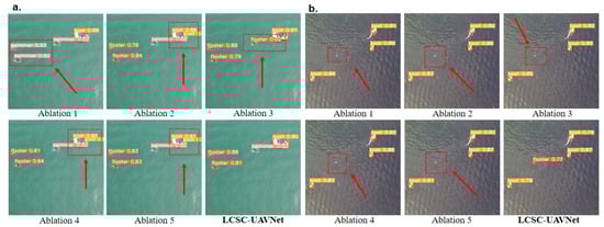 Visualization results of the ablation experiments on the SeaDroneSee dataset. (a) Medium-altitude UAV image; (b) high-altitude UAV image. The red arrow and dotted square in the figure indicate cases of missed or false detections by the comparison algorithm.