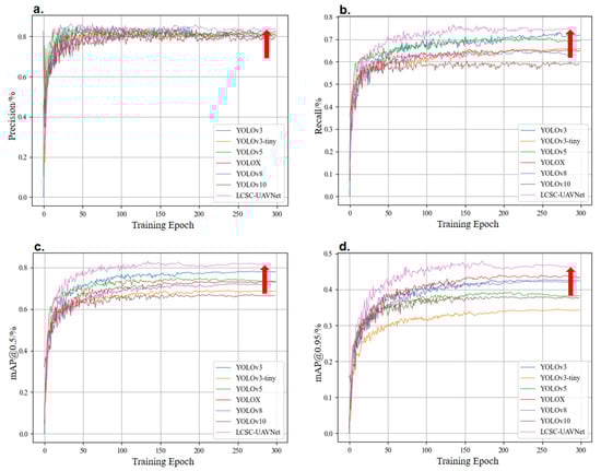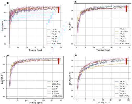 Comparison of the algorithm with the LCSC-UAVNet algorithm on the AFO dataset for each metric. (a) Precision curve comparison, (b) recall curve comparison, (c) mAP@50 curve comparison, (d) mAP@95 curve comparison. The red arrow indicates the position of the proposed algorithm LCSC-UAVNet in the figure.