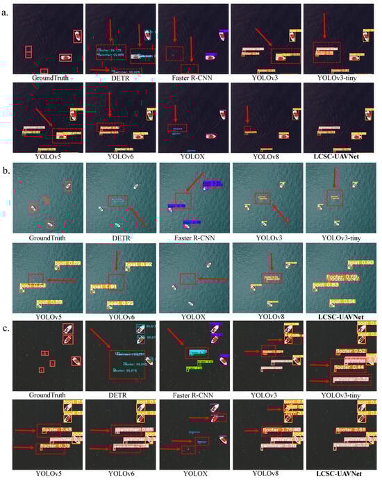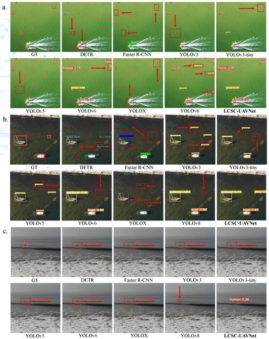 To rigorously evaluate the algorithm’s performance in complex sea states, this paper presents three visual results selected from the MOBDrone dataset, as shown in Figure 11. All images were captured at the same altitude to ensure a fair comparison. Figure 11a depicts a drone image of wave disturbances in complex sea states; Figure 11b shows a drone image of small targets on a calm sea surface; and Figure 11c shows a UAV image of small targets in a complex nearshore background under a simulated rainy environment, with the rain streaks generated using the model proposed in reference [37]. As shown in Figure 11a, on the image with wave disturbances, mainstream algorithms exhibit issues such as false negatives and bounding box overlaps in the detection of ships and personnel, while LCSC-UAVNet successfully avoids false detections. In Figure 11b, regarding the detection of two swimmers, mainstream algorithms encounter false positives or false negatives, struggling to handle variations in swimming posture, whereas LCSC-UAVNet accurately identifies the swimmers without any false detections or omissions. As shown in Figure 11c, in the task of detecting ships, onboard personnel, and lifebuoys under a simulated rainy environment, some algorithms detect only the ships while failing to recognize the personnel and lifebuoys. Other algorithms detect the personnel but fail to identify the lifebuoys and mistakenly classify raindrops as human targets. In contrast, LCSC-UAVNet successfully detects all targets, accurately identifying multiple small targets in complex scenarios. In conclusion, when confronted with complex sea surface textures, LCSC-UAVNet demonstrates robust target detection capabilities, accurately recognizing various targets within the images.