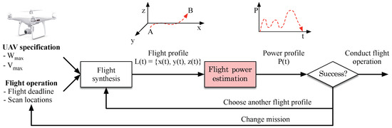 One of the most effective strategies for conserving energy is to develop an optimal flight profile—a plan that specifies both the route and velocity over time to minimize energy consumption. Predictions of accurate power consumption for various flight profiles are crucial before conducting the actual flight. Figure 1 shows the typical decision process for the UAV flight operation, such as surveillance and parcel delivery. First, the UAV specification is defined for the flight operation, such as maximum payload , maximum flight velocity , etc. Then, flight constraints for the operation are defined, such as the flight deadline and scanning locations. The information is used to synthesize the flight profile to perform the mission. The profile includes the positions () of the UAV over time. The power profile must be estimated by to check the profile is feasible under the given battery. If the power capacity or energy capacity of the battery is not enough, one should choose another or, in the worst case, another type of UAV should be used. As shown in below case, the need for estimating the power consumption of UAVs is inevitable.