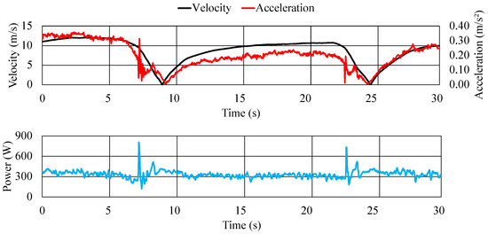 As the mass of a drone increases, the amplitude of random vibration acceleration tends to decrease, aligning with principles of general dynamics, such as the harmonic oscillator model. Consequently, acceleration-related factors, including random vibrations, are less significant for larger drones. This means that power modeling is much easier for larger drones. However, this relationship does not apply to smaller drones, where vibrations remain a crucial factor to consider [5]. This challenge is compounded by the fact that random vibration acceleration cannot be accurately derived by simply differentiating velocity. Figure 2 demonstrates this disparity, showing the difference between the horizontal velocity and acceleration data recorded by the UAV’s inertial measurement unit (IMU) over 30 s. Notably, random vibration acceleration is observed even during hovering, where there is no horizontal movement, and it still contributes to power consumption. Additionally, a significant acceleration spike is detected at the 7-s mark when the UAV changes its velocity monotonically; this is attributable to factors such as posture control rather than just changes in speed. These observations indicate that random vibration acceleration cannot be accurately inferred from velocity data alone. Instead, it is more feasible to derive random vibration acceleration by analyzing the movement characteristics of the UAV, which is obtained through experimental data.