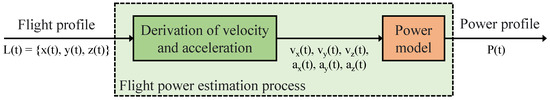 Figure 3 shows the typical power estimation framework. First, the flight profile as time-based location data is given in the simulation stage, and the velocity and acceleration information are derived through differentiation. At this point, the power consumption at a given time is derived using the provided power model. Therefore, it is the most important to construct an accurate power model for the purpose of obtaining a precise . While there were various processes conducted for constructing a power model in the previous work, this paper introduces two commonly used approaches: a polynomial model using linear regression, which is one of the most widely adopted methods; and a network model using DNNs, which has recently gained significant traction.