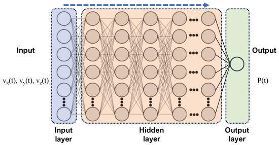 Among machine learning methods, DNN is a data-driven, black box-type modeling technique that makes predictions and classifications based on training data [14,15]. Figure 4 shows the typical structure of DNN to infer with , , and , where the velocities of a UAV are derived from differentiation like in (2). Several hidden layers are situated between the input layer (representing UAV velocity) and the output layer (representing UAV power consumption). As the number of hidden layers increases, the model can capture more complex relationships within the data, enabling more accurate modeling with fewer parameters when compared to traditional data estimation methods. However, as the number of hidden layers increases, the time required for training also grows. Moreover, using an excessively large number of hidden layers can lead to reduced accuracy as the model may become overly complex and prone to overfitting.
