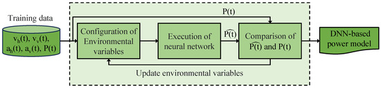 Figure 6 illustrates the structure of the DNN-based power model. This process begins with obtaining flight information: and . These are used as independent variables for training the DNN. The corresponding at each UAV motor is set as the dependent variable. Next, the neural network environment variables are configured to enable efficient deep learning. These variables determine how to allocate weights, measure errors, and choose the optimization function. The number of hidden layers is also specified at this stage. Once the independent variables and environment settings are in place, the neural network is run to generate a prediction of . This predicted output is then compared with the measured . The environment variables are updated based on the difference between the predicted and measured data. The propagation of the neural network is repeated, and if the difference falls below a specified threshold, the training process is terminated.