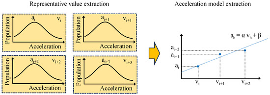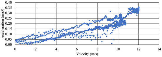 After conducting sufficient flight experiments, multiple acceleration points were populated for a given flight velocity , as shown in Figure 8. From these data points, the most frequent (largest population) value was selected as the representative acceleration value at . Similarly, for the next flight velocity , the corresponding representative was chosen. This allowed us to create a trend line connecting the representative acceleration values. Finally, a linear regression method was then applied to derive the linear acceleration model as follows: