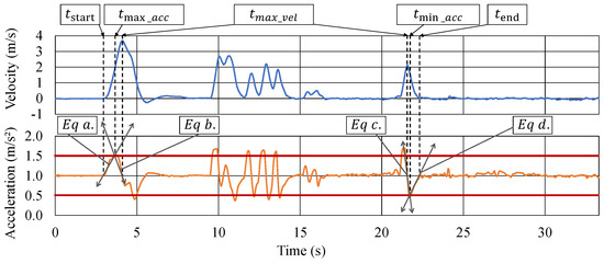 The vertical velocity and acceleration exhibit distinct trends during ascent and descent due to the influence of gravity. As shown in Figure 9, indicates the moment when the drone begins to ascend, represents the point of maximum acceleration during the ascent, corresponds to the point where the drone reaches its maximum velocity, marks the point of minimum acceleration during deceleration, and is when the drone comes to a complete stop, respectively.