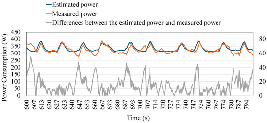 Figure 13 compares the estimated power consumption derived from the polynomial model (blue color) with the measured value (orange color). The mean absolute percentage error (MAPE) by the polynomial model was 4.61%. In addition, the difference between the measured power and the estimated power was a maximum of 54.98 W and an average of 14.82 W. Overall, while the estimation result generally followed the measured values, the polynomial model failed to accurately estimate certain cases of lower power consumption. This is because the model does not adequately capture vertical flight or hovering, which significantly affects power consumption.
