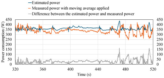 Figure 14 shows the discrepancy between the predicted power model and the measured results with the moving average applied. The MAPE was 11.28%, and the difference between the predicted power and the measured power was up to 163.89 W and 31.14 W on average. The significant difference between the measured and predicted results was primarily due to the model’s inability to account for factors such as attitude control and the effects of wind. Therefore, to accurately model the power consumption of a UAV, it is essential to consider its acceleration.