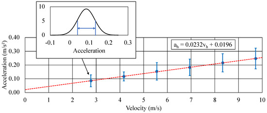 The implementation of a data-driven acceleration model was performed based on the distribution of the acceleration in each UAV velocity. Figure 15 presents the modeling results for horizontal acceleration. Horizontal flight experiments were conducted at six different velocities (2.78 , 4.17 , 5.56 , 6.94 , 8.33 , and 9.72 ). For each velocity, the populations of acceleration were analyzed. For example, the average, standard deviation, and highest population at 2.78 were 0.085 , 0.043, and 0.129 , respectively. Each dot in the figure represents the highest population in each velocity, while bars at each velocity indicate the standard deviation above and below the highest population. The red dashed line represents the data-driven acceleration model , as described in Equation (3).