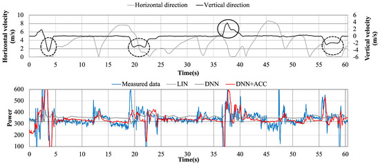 Figure 16 shows a part of the simulation results with three different models for a 30 min experimental UAV flight. The average and maximum horizontal velocities were 3.4 and 11.46 , respectively. The maximum velocities were −4.74 for ascending and 3.98 for descending. In the figure, dashed circles are used to for ascending and solid circles for descending. In the graph below, a blue line means measured power consumption as a golden reference, a dashed line means results obtained by the polynomial power model (LIN), a gray line means results obtained by the DNN-only power model with velocity inputs (DNN), and a red line means the proposed hybrid DNN-based power model (DNN + ACC).