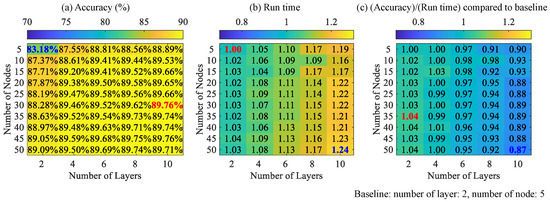 Figure 17 shows the accuracy, runtime, and relative performance of the DNN for different configurations. The red values in the figure represent the baseline configuration with the highest performance for each evaluation metric, while the blue values correspond to the lowest observed performance. This comparison highlights the trade-off between accuracy and computational efficiency for different DNN configurations.