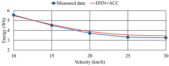 Figure 18 shows the energy consumption by horizontal velocity between the measured data and simulation data. The flight distance was 100 m, and the altitude of the flight was 30 m. Blue dots mean the experimental results performed at 10, 15, 20, 25, and 30 km/h. A red line represents the simulation results achieved by the proposed hybrid DNN-based power model. It was confirmed that the estimated energy consumption at each velocity closely matched the experimental results. In addition, the simulation results showed that 30 km/h was the most energy-efficient velocity.