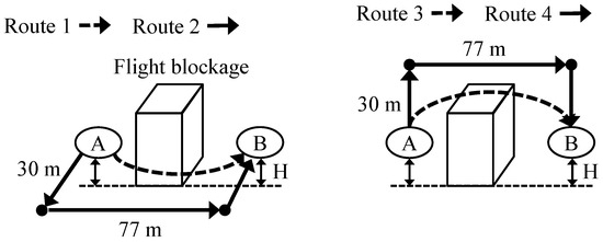 In this section, we discuss the problem of finding the most energy-efficient path for a UAV to reach its destination while avoiding obstacles. Figure 19 shows four different flight routes from Location A to B when detouring through a flight blockage. A and B were placed H higher than ground, and the distance between the two was 77 m. Route 1 and 2 detoured through the blockage for 30 m in a horizontal direction, and it detoured through Route 3 and 4 for 30 m in a vertical direction. We assumed that the horizontal and vertical velocities in this case study were 4.5 m/s and 3.0 m/s, respectively. It is possible to know which route is the most energy efficient with the proposed power model.