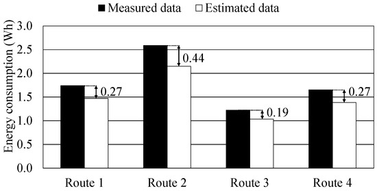 Figure 20 shows the measurement results (block bar) and simulation results by the proposed power model (white bar). Route 3 was found to be the most energy-efficient flight route when considering both the measurement and simulation results. It is possible to pick the most efficient route with the proposed model even if there is some difference between the measured and simulated results. Additionally, overall, the predicted energy consumption data were smaller than the measured data. The primary reason for this discrepancy lies in the abrupt changes in the flight path, as illustrated in Figure 20. During the actual flight experiments, when the flight path changed direction suddenly, the UAV decelerated before accelerating to reach the target speed. This process resulted in higher energy consumption than what was predicted by the simulation.