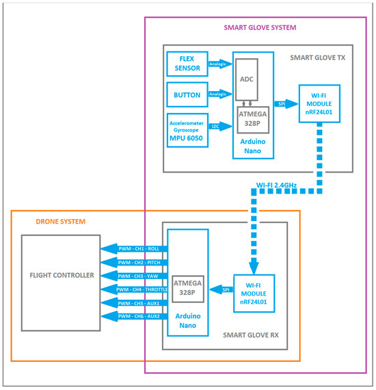 Figure 1 illustrates a block diagram of the smart glove–drone system, showcasing the communication between the transmitter (glove-mounted), the receiver (drone-mounted), and the drone. The receiver (RX) and the flight controller communicate via signals. In specific configurations, we adopted the PWM technology to transmit information based on the pilot’s commands to the flight controller, which processed these data to manage the motors and ensure the drone’s stability and control.