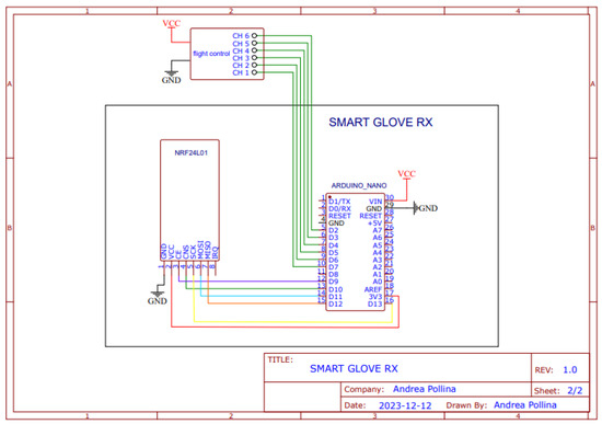 Electrical diagram of the smart glove Rx system (Smart Glove RX) showing the interconnections of the Arduino Nano board with the NRF24L01 and the flight control modules located on the drone.
