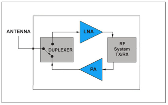 The PA is powerful, so the signal is merely amplified. Conversely, the LNA (low-noise amplifier) is the type of equipment that receives a pretty weak signal (practically under the microvolts level, i.e., approximately −100 dBm) coming from the antenna and, therefore, enough voltage (usually it is generated from about 0.5 to 1 V). This is implemented from the interconnection between the low-noise amplifier, the LNA in the receiver path, and the PA, the power amplifier in the transmission path, if a duplexer is applied in the vehicle’s lifecycle. This part splits the two signals, so the powerful output of PA causes no overload on the sensitive input of the LNA (Figure 4).