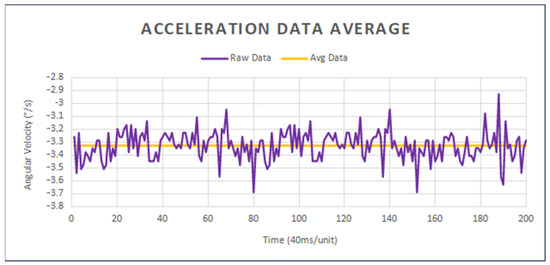 Since in applications that rely on sensors such as accelerometers and gyroscopes, the raw data often contain minor inaccuracies, typically due to the presence of noise or stochastic fluctuations that can hurt the measurement accuracy, in the case of the acceleration measurement, we used the average measurement over 200 periods. In this way, we could improve the stability and reliability of the measurements. This averaging process was performed by a specific loop that iterated the calculation of rotation angles, utilizing data from both the accelerometer and gyroscope across 200 periods, ultimately yielding the arithmetic mean of the collected data.