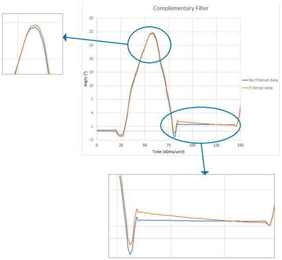 To carry out the effective flight control of the drone during the lifted stage, the complementary filter and the implementation of the accelerometer and gyroscope data were most advantageous in better estimating the movement angle. In the long run, the gyroscope started to drive, causing wrong data to be detected. On the one hand, the accelerometer provided the exact values when the mechanism slowly accelerated, but when the device vibrated, it passed wrong and excessive angle values. From the two pieces of data, namely the gyroscope and accelerometer, the glove pilot should rectify them to eliminate noise and unexpected motions. In Figure 8, comparing the two curves, the correction provided by implementing the complementary filter is evident. The detailed insets show that the unfiltered data curve exhibits a series of ripples, while the filtered data curve is smoother and more linear.