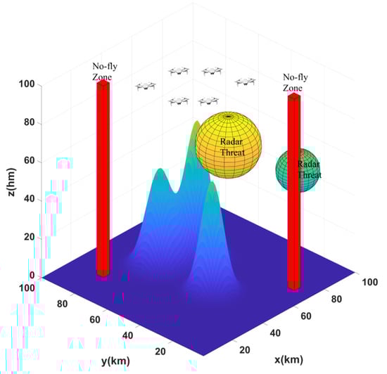 In path planning for multiple UAVs, they are subjected to various threats such as mountains, radars and no-fly zones, and motion and attitude constraints, which were modeled and analyzed in this study. As shown in Figure 1, the radar detection range is described as a sphere based on its operating principle, the no-fly zones are modeled as cuboids since the forbidden areas of UAVs are usually regular-shaped buildings or grounds, and mountains are modeled as undulations. Multiple UAVs should avoid these threats to reach destinations safely and efficiently while satisfying motion and attitude restrictions.