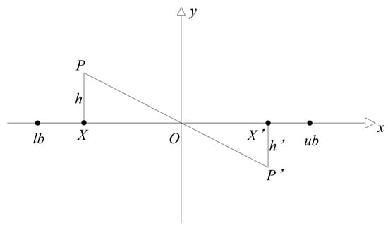 A lens imaging inverse learning strategy is also introduced in this study, which further enhances the diversity of the initial solutions. Compared to the ordinary backward learning strategy, the lens imaging inverse learning introduces a scaling factor k, which is more conducive to obtaining the global optimal solution. The schematic diagram is shown in Figure 5. By generating the inverse solution of the current initial solution through inverse learning, and comparing it with the fitness of the original solution, the initial solutions are updated, thereby further increasing the probability of the algorithm escaping from local optima.