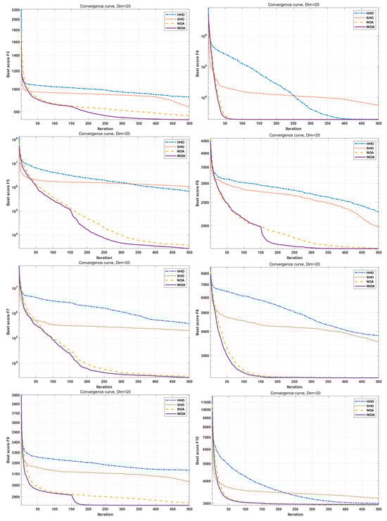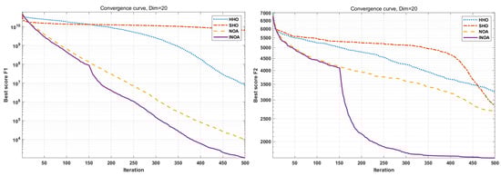 To show the superiority of INOA, it was compared to NOA, Harris hawks optimization (HHO), and sea horse optimization (SHO). The population size was set to 50, the maximum number of iterations to 500, and the dimensionality to 20. The algorithms were run 30 times, and the average values were taken for the simulation. The simulation results are shown in Figure 8. It is seen that INOA achieved the best results on all 10 functions during the entire search process, except for functions F2 and F6, where the global search performance does not outperform but still keeps pace with NOA in the early stage.
