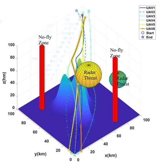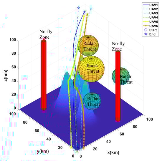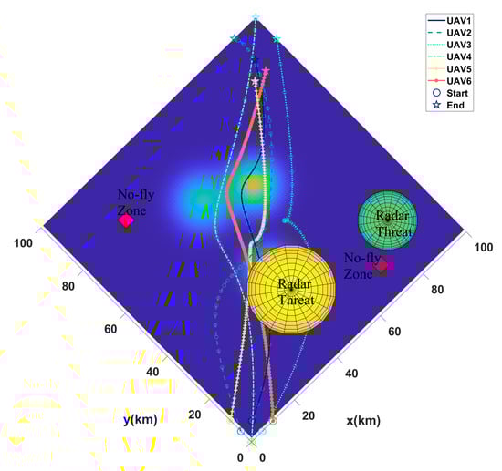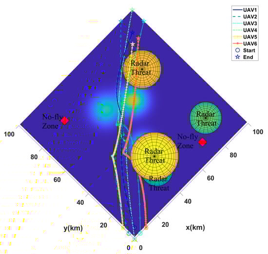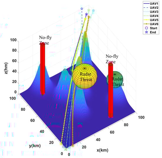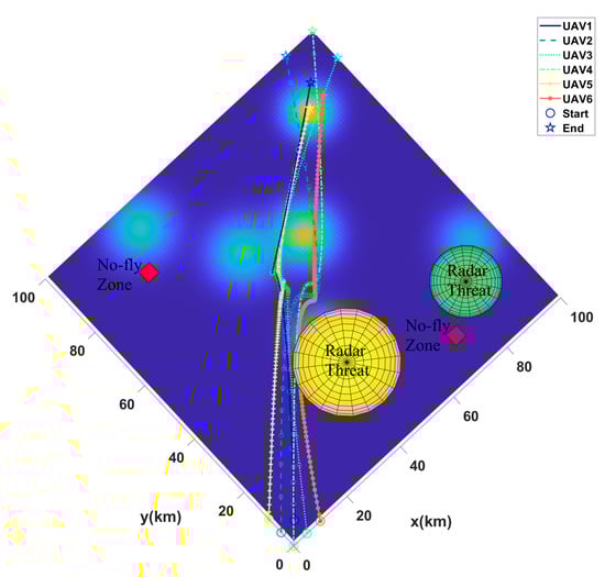 The result of multi-UAV path planning in the first scenario with 6 UAVs, 3 mountains, 2 radars, and 2 no-fly zones.
