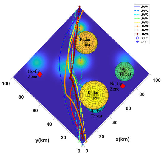 To enhance the persuasiveness of the algorithm, the fourth scenario considered a more complex situation, in which the number of UAVs was set as 8, with 20 waypoints for each. The start points for each UAV were set as (0, 0, 0), (0, 0, 5), (0, 5, 0), (0, 5, 5), (5, 0, 0), (5, 0, 5), (5, 5, 0), and (5, 5, 5), while the end points were (95, 95, 100), (95, 95, 95), (95, 100, 95), (95, 100, 100), (100, 95, 95), (100, 95, 100), (100, 100, 95), and (100, 100, 100). Additionally, the number of mountains and radar threats increased to 6 and 4, respectively.
