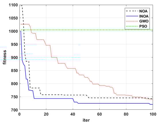 To address the advantages of the proposed INOA, a comparative analysis was performed between PSO, GWO, NOA, and INOA based on the first scenario. The parameters of PSO can be found in [], and those of other algorithms are properly selected and shown in Table 2. To avoid randomness, all algorithms were run 30 times.