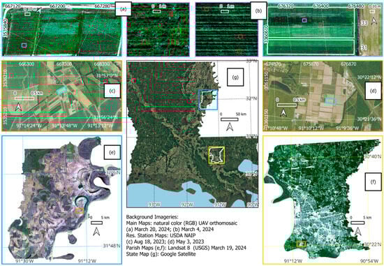 Cover crop biomass prediction study sites with inset maps showing examples of sampling distributions. (a) Northeast Research Station (NERS) in Tensas parish, LA. (b) Central Research Station in East Baton Rouge parish, LA. The coordinate reference system (CRS) used was EPSG 32615 (Universal Transfer Mercator, UTM, zone 15 with World Geodetic System, WGS, 1984 ensemble datum). Reference easting and northings are shown in the maps of the fields (a,b) and the station maps (c,d). The corresponding reference geographic coordinates are shown in all maps except for the inset maps. Red squares in (a,b) indicate the biomass sampled locations with detailed shown in the inset maps (highlighted as purple rectangles). Cyan rectangles in (c,d) highlight the location of the study fields in the station overview maps. Orange rectangles in (e,f) highlight the location of NRS and CRS in the corresponding parishes. Yellow rectangles in (g) highlight the location of the East Baton Rouge and Tensas parishes in Louisiana.