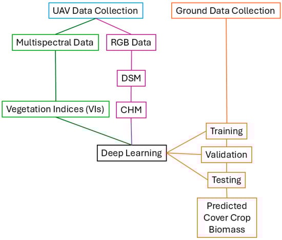 The workflow of the cover crop biomass prediction model in this study. UAV, unmanned aerial vehicle. RGB, red green blue or natural color aerial imagery data. DSM, digital surface model. CHM, modeled canopy height.