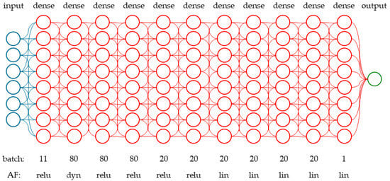 In this study, the different hyperparameter configurations of a deep neural network were explored, facilitated by the Keras and TensorFlow libraries [42]. The performance levels of these models in predicting cover crop biomass as a function of VIs and the CHM were compared. The metric for accuracy performance was based on the root mean square error between the predicted (test results) and measured cover crop biomass. The basic structure of the Tensor network had 11 dense layers, with the number of batches and fixed activation functions shown in Figure 3. The fixed and dynamic hyperparameters (8 optimizers and 8 activation functions) are detailed in Table 2 [43,44,45,46,47,48,49,50,51]. The architectural configuration was informed by similar previous studies and an initial analysis of similar datasets, and it strikes a balance between accuracy and timeliness. For each configuration of the dynamic hyperparameters, the model was run 3 times, with the best results chosen as the final output.