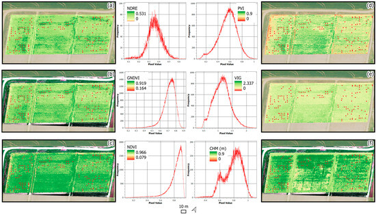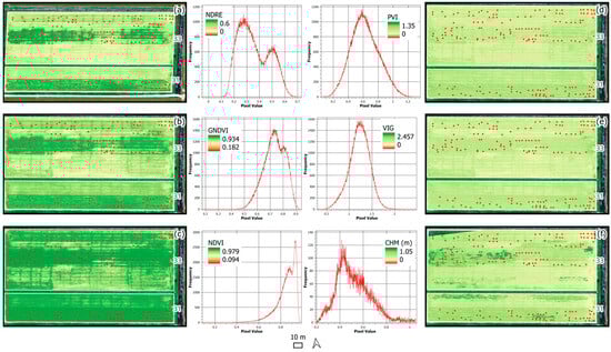 Spatial variability and histogram of remote-sensing data used in this study at CRS (6 March 2024). (a) NDRE, Normalized Difference Red Edge. (b) GNDVI, Green Normalized Difference Vegetation Index. (c) NDVI, Normalized Difference Vegetation Index. (d) PVI, Perpendicular Vegetation Index. (e) VIG, Vegetation Index Green. (f) CHM, Modeled Canopy Height.