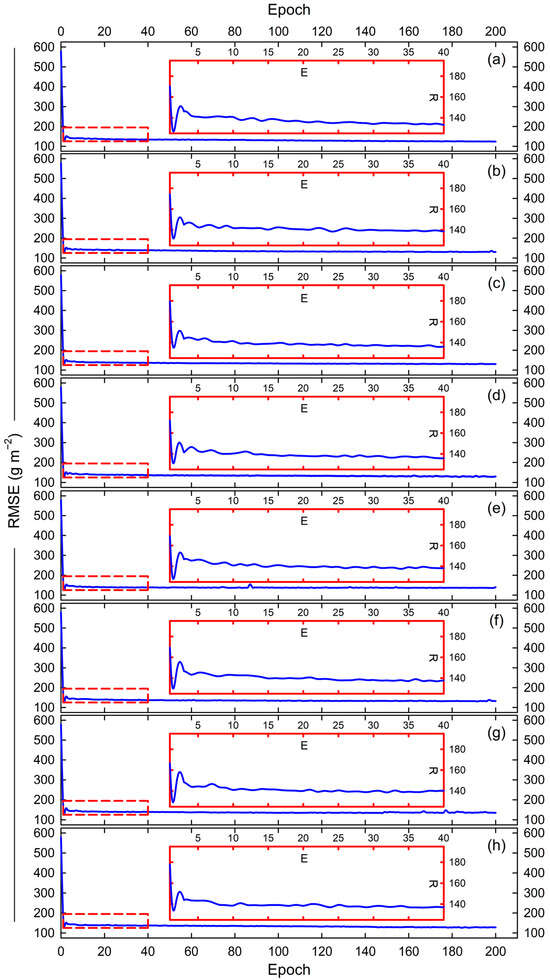 Neural network training progresses to predict cover crop biomass with sigmoid (a), tanh (b), ReLU (c), exponential (d), linear (e), SELU (f), ELU (g), and SiLU (h) activation functions. Detailed results within the first 40 epochs (E) are shown in the inset graphs, where R represents RMSE.