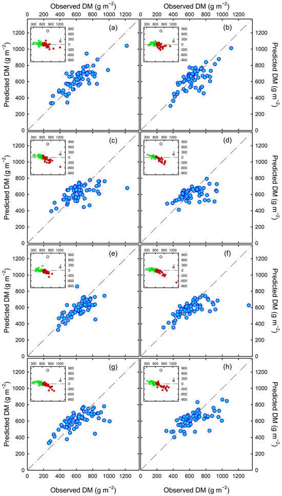 Validation results of cover crop dry matter (DM) prediction with TensorFlow models using sigmoid (a), tanh (b), ReLU (c), exponential (d), linear (e), SELU (f), ELU (g), and SiLU (h) activation functions. Residuals expressed as predicted − observed (−e) as a function of the observed DM are shown in the inset graphs.