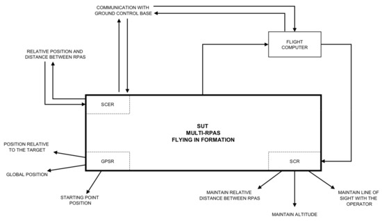 The context of the multi-RPAS operation is based on the ConOps of the mission. Therefore, the interfaces of the SUT must be taken into account. Consider the SUT as a black box containing the communication system between the RPAS (SCER), the Global Positioning System of the RPAS (GPSR), and the control system of the RPAS (SCR). These are associated with the external elements of the vehicle through information exchange, as illustrated in Figure 3.