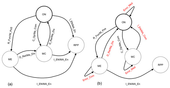The state machines are constructed based on the events that occur; for each event, there will be an action leading to a specific state. Figure 4a represents the nominal operation of the system, in this case, the formation flight, where it is not constructed with conventional operational events. Figure 4b represents emergency or specific operational states that may occur; in these cases, anomalous events and actions may arise, such as measurement errors (Erro_Med) or calculation errors (Error_Com), which are associated with the vehicles’ flight computer.