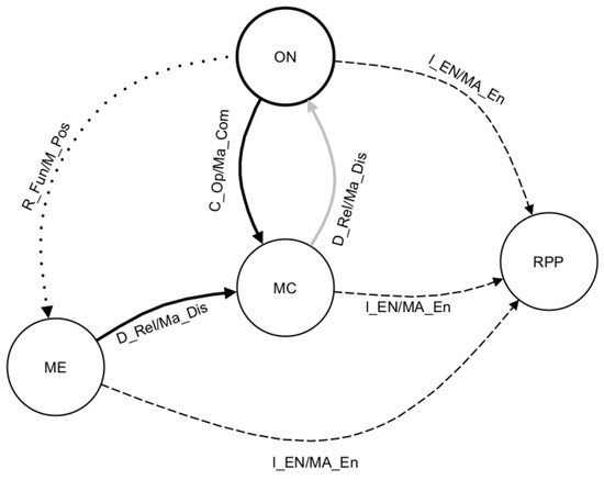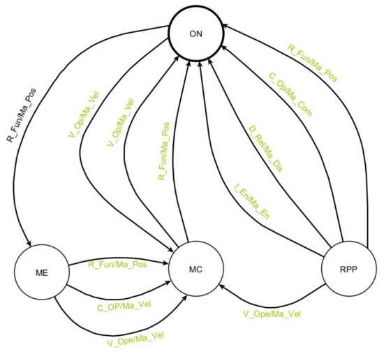 When encountering the event of moving out of the functional range (R_Fun), the action of maintaining position (“Ma_Pos”) is required to transition from the ON state to the ME state (indicated by the dotted line). Subsequently, if the event of losing relative distance (“D_Rel”) occurs, it must perform the action of maintaining distance (“Ma_Dis”) to transition from the ME state to the MC state (represented by the black line). Additionally, there is the possibility of losing communication with the operator (“C_Op”), and through the action of maintaining communication (“Ma_Com”), it transitions from the ON state to the MC state to perform correction maneuvers and, upon regaining control, returns to nominal operation by correcting the relative distance between vehicles (“D_Rel”) and maintaining distance (“Ma_Dis”) (depicted by the grey line).