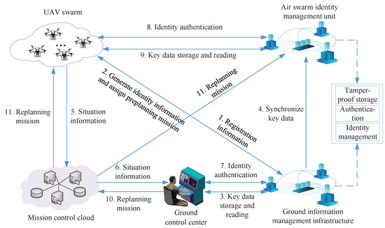 - The GIMI is a distributed system composed of organizations involved in UAV swarm application and is deployed on the ground, which is used to store key information such as the identity of the UAV, complete the identity authentication of the mission control cloud and the UAV, and provide key data to the ground control center;