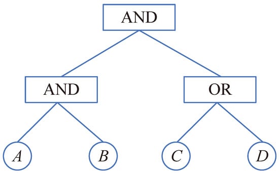 In an access-control scheme based on ABE, the access policy for a certain data is expressed by a Boolean formula, such as , where A, B, C, and D represent specific attributes. The access policy indicates that users who can access the data must have attributes A, B, C or A, B, D at the same time. The access policy can also be replaced by an access tree that is easier to understand. The details are shown in Figure 1.